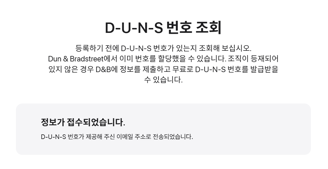 연락처 정보에 입력한 이메일로 D-U-N-S 번호가 전송됩니다